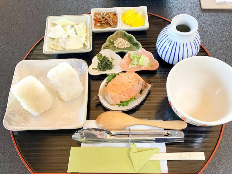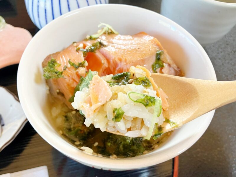 新米のおにぎりが2つと、お茶漬けのセットがついてきます。厚みのある鮭が食欲をそそりますね〜。