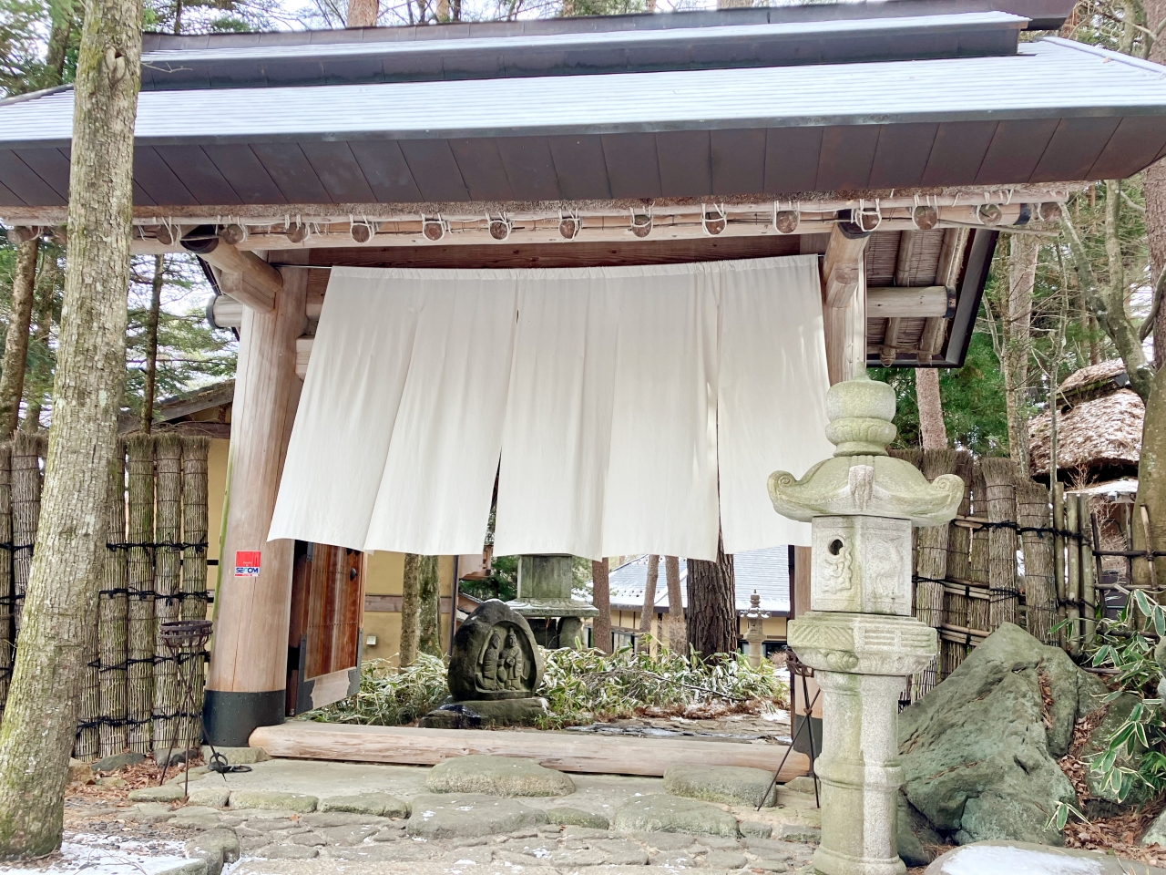 お客さんに教わった通りに奥に進むと、暖簾のかかる建物があります。こちらが、「安曇野うどん」の入り口です。
