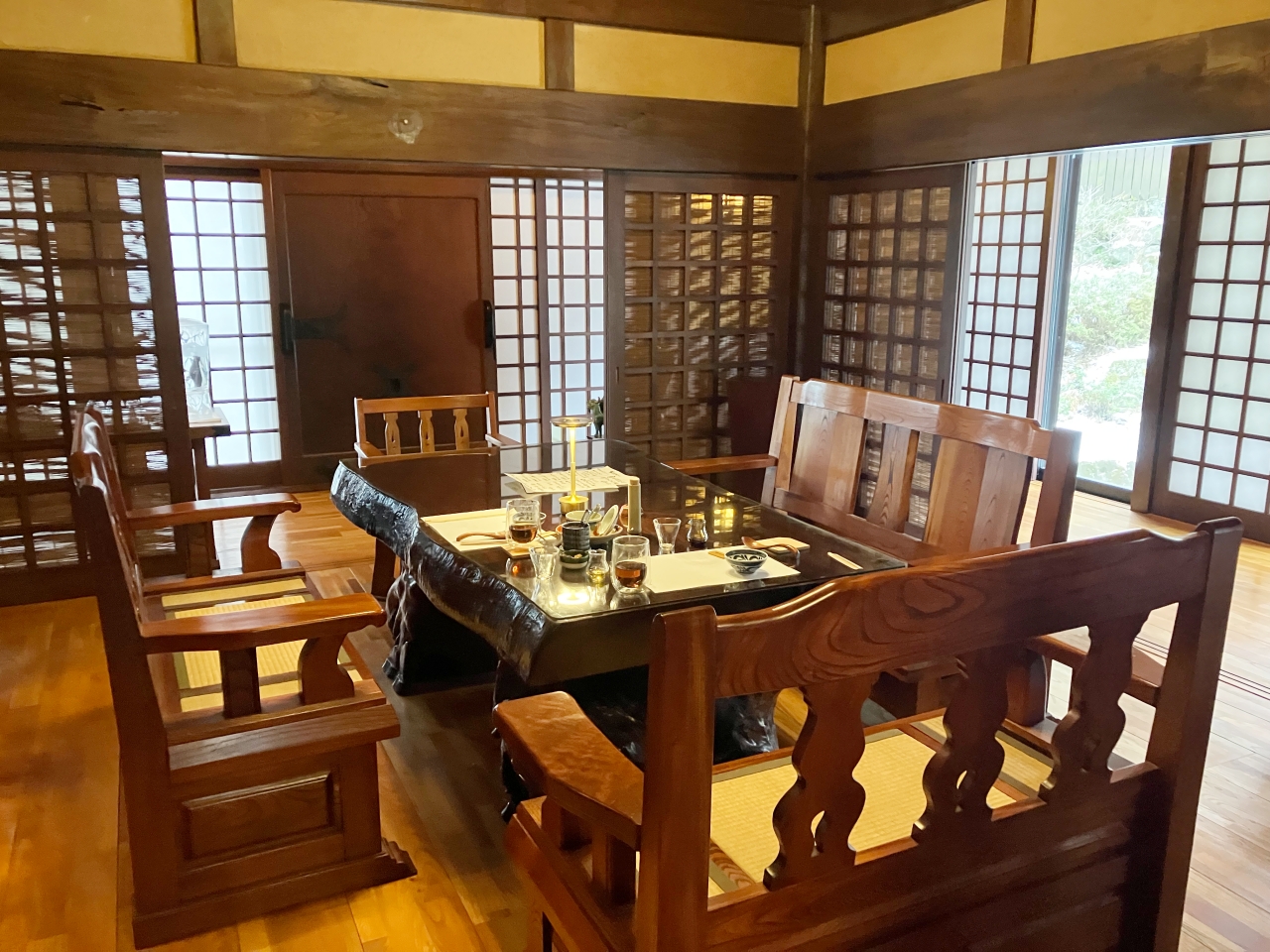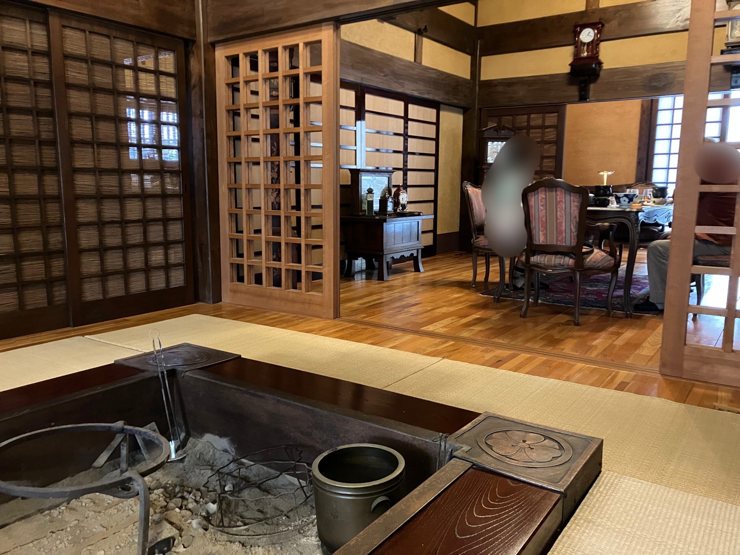 大きな4部屋それぞれに違う感じのダイニングが広がっています。手前はいろり。奥はテーブル席になっています。