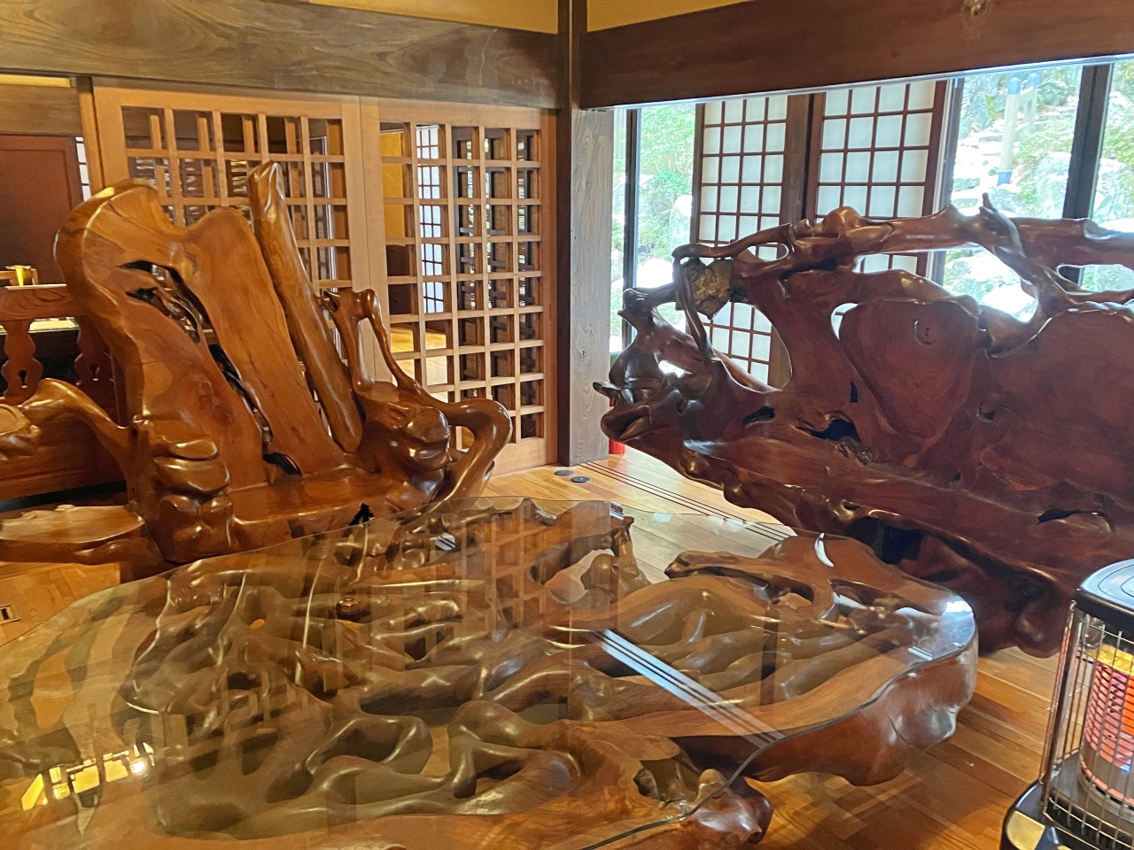 こちらは一枚板であろう大きな木を加工した椅子やテーブルが並んでいます。「すごい!」の一言しか出ないのが、情けないですが、こんなダイニングセットを見たのは初めてです。