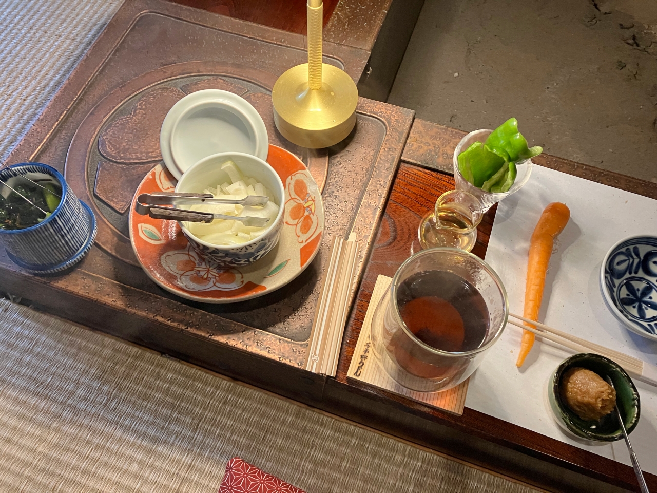 注文を済ませると、うどんができるまでと、漬物など野菜を持ってきてくれました。麦茶も一緒に持ってきてくださったのですが、大麦を削って振りかけることでさらに麦の香りが引き立つそうです。