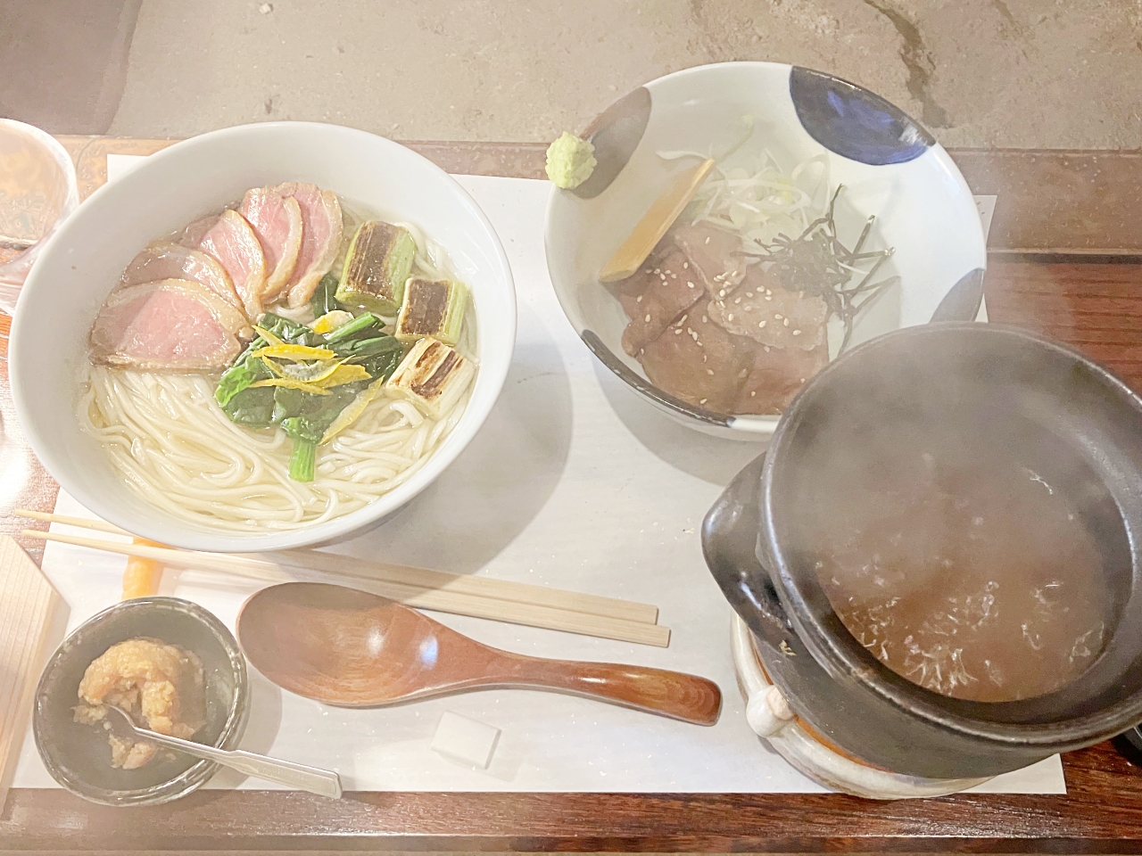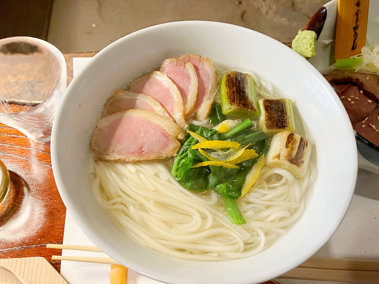 ネギとほうれん草、鴨、ゆずと乗った素うどん。だしは味がついてないので、つけ汁をつけながらいただきます。喉越しの良いツルッとした食感がうれしいおうどん。