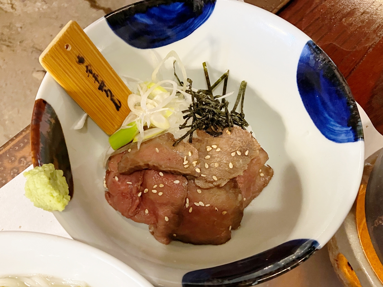和牛ローストビーフ。ご飯多かったら食べ切れるかなと思っていたのですが、ちょうど良いサイズです。わさびの他にゆずぽんずも用意。好みでかけていただきました。