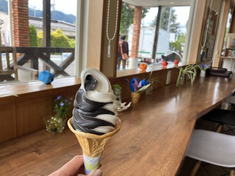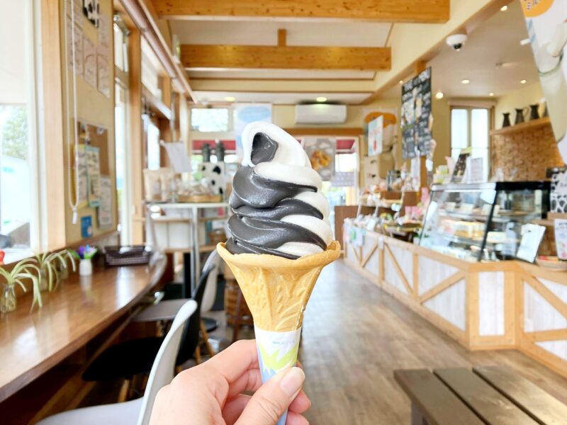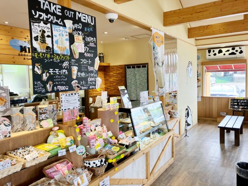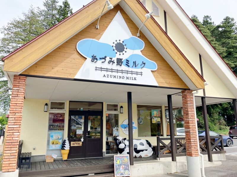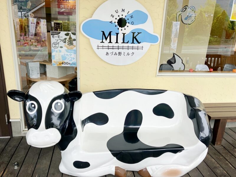 牛柄のデザインが可愛らしい「あづみ野ミルク」では、安曇野で育った牛たちのミルクをつかったスイーツやソフトクリームが楽しめます。