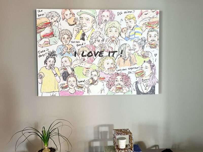 入り口には、みんながバーガーを食べる絵が飾られています。