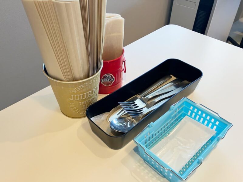 テーブルには、バーガー袋やカトラリーが置いてあります。