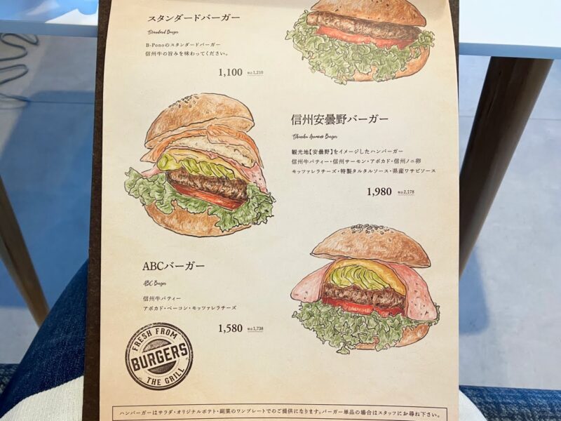 「アメリカンダイナー B-Pono」では、地元の素材を使った美味しいバーガーが食べられます。豊科のグルメ街道沿いに新しくオープンしたお店です。