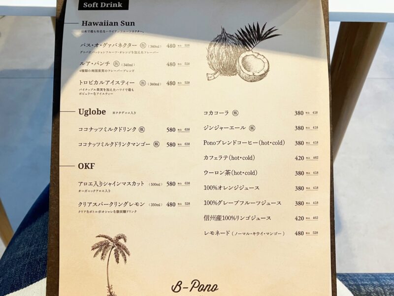 ソフトドリンクは、ハワイアンフルーツナタデココを使ったものも。