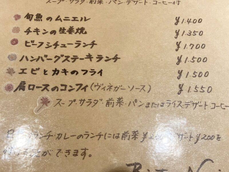 洋食屋「ビストロ ノリ」のメニュー