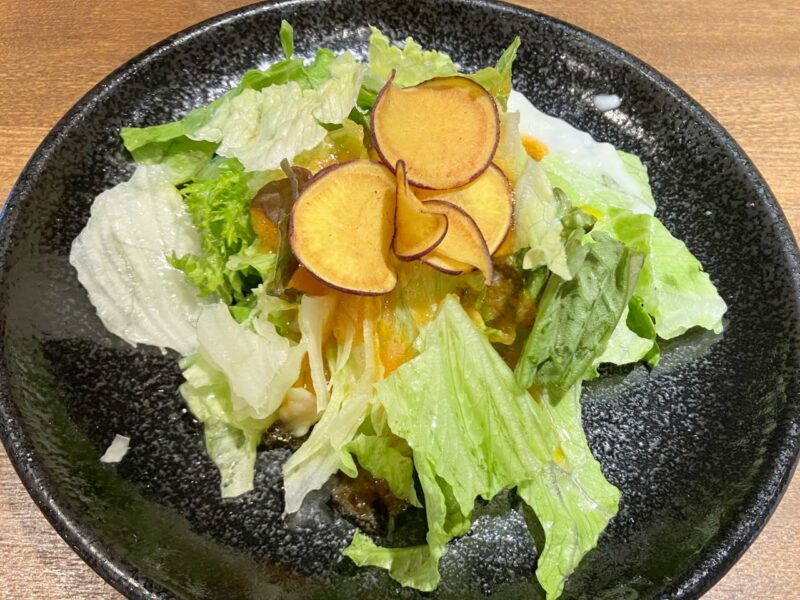 サツマイモ のチップがトッピングされたサラダ。