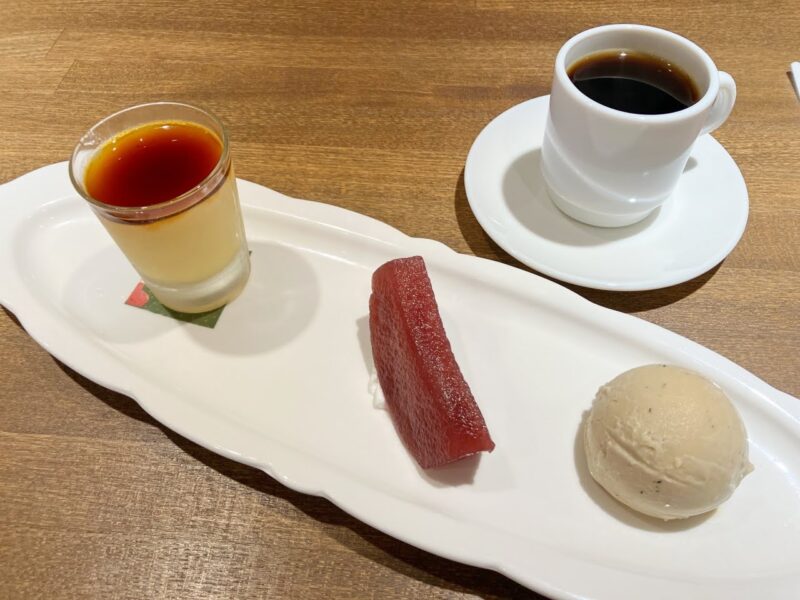 〆のデザートは、プリン・りんごのコンポート・ほうじ茶アイスの3点盛り。