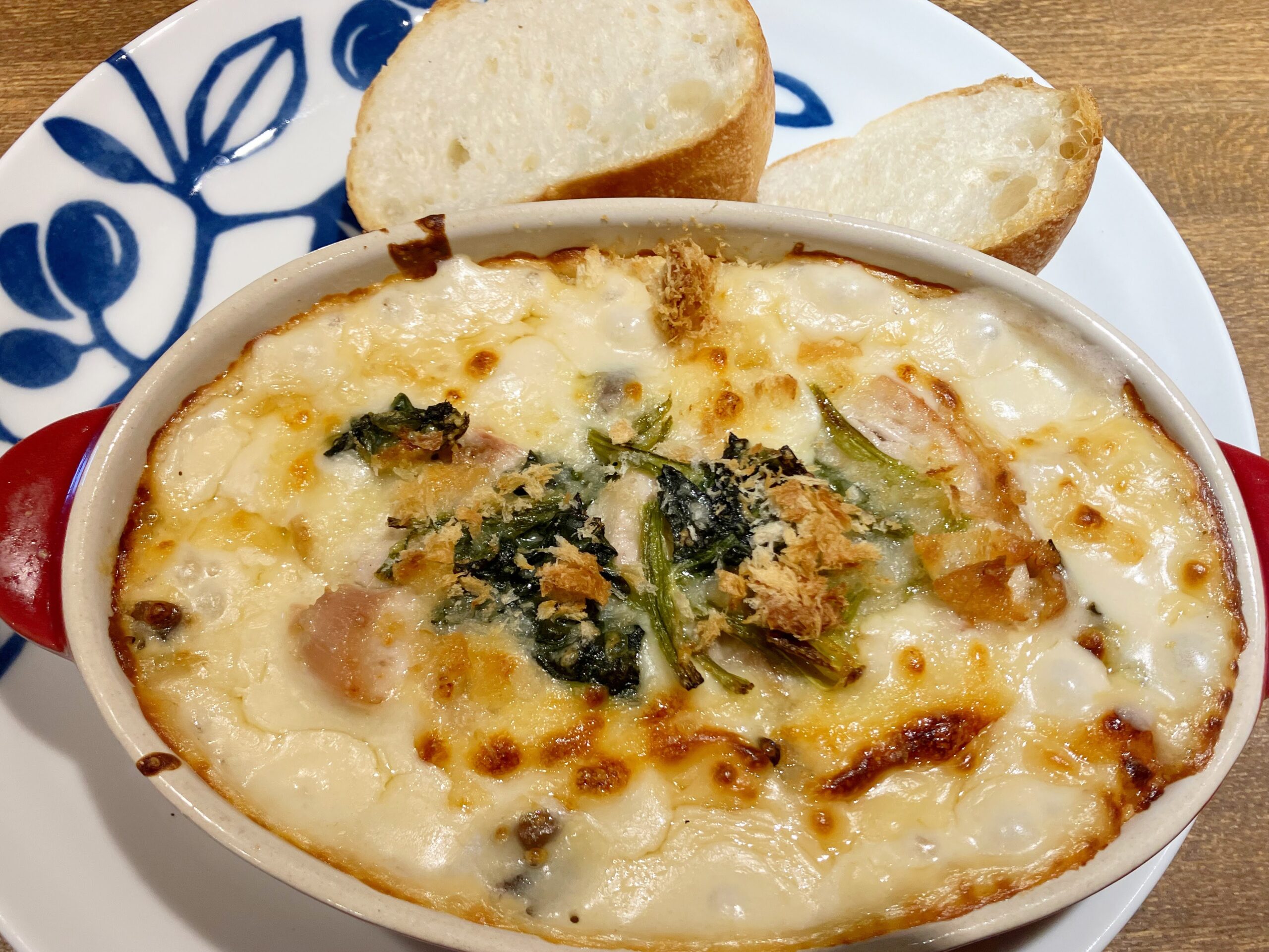 きのこと鶏肉のグラタンです。ほうれん草も入ってますね。