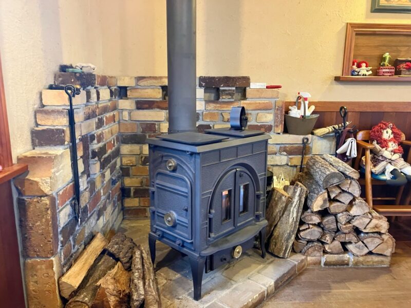 上にはすてきな薪ストーブがあり、ほっと一息つける空間です。