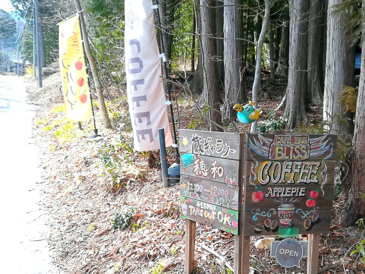 森の空気とおいしいコーヒーとアップルパイが楽しめる「CAFEBUS BLISS&蔵ギャラリー穂和」。