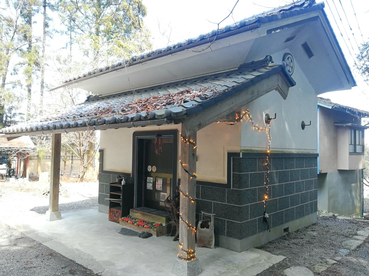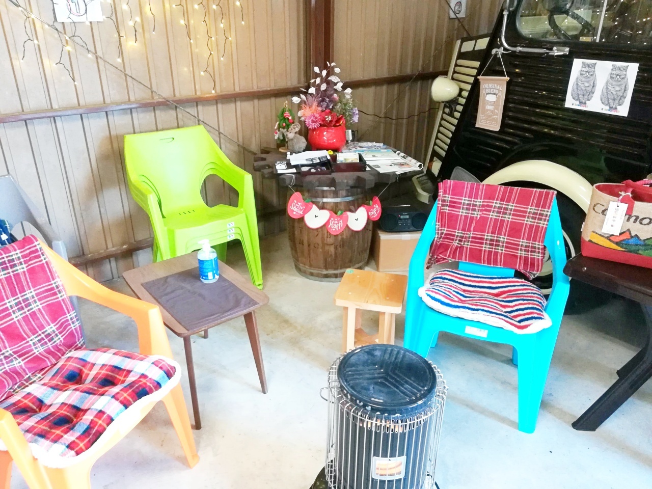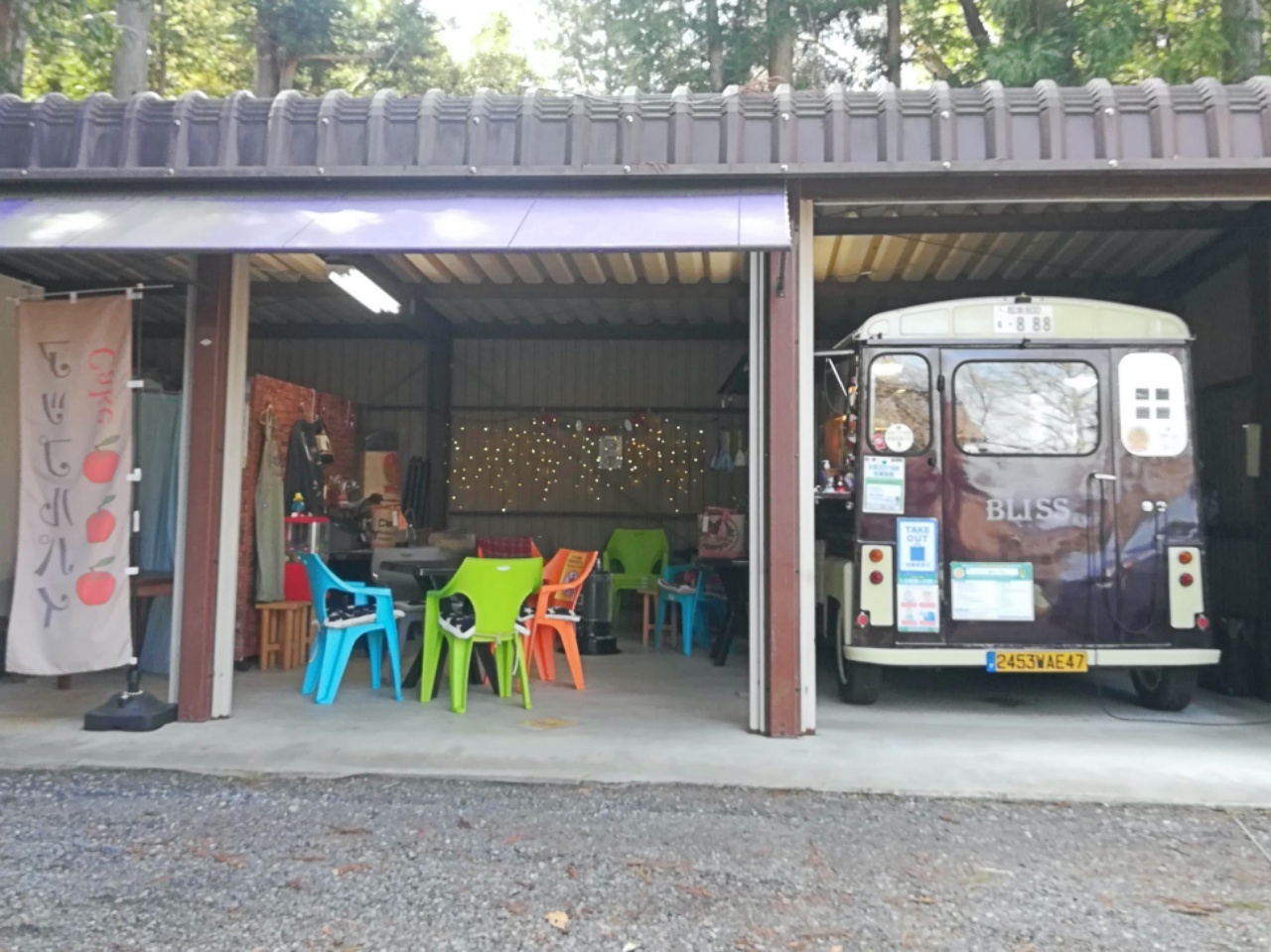 以前は、蔵の横にカフェバスがあったそうですが、コロナの影響で外の営業をするために、こちらのガレージに移動したそう。
