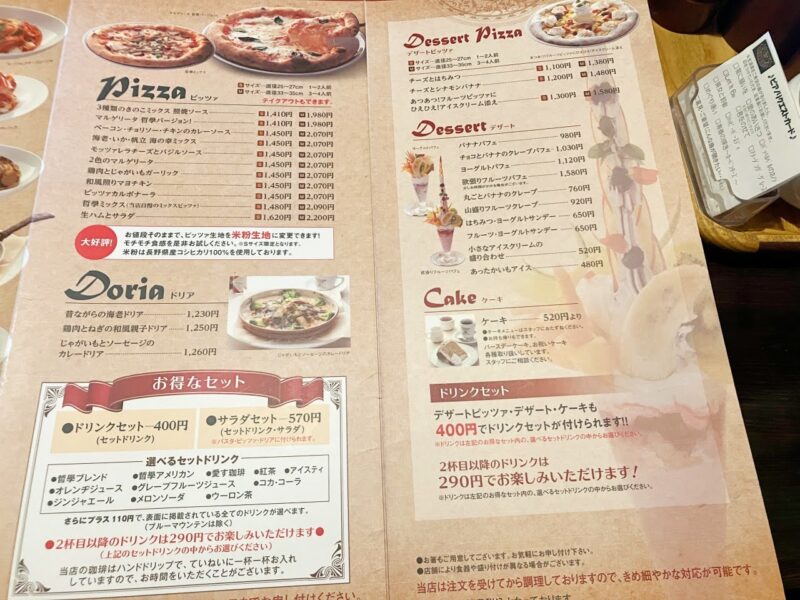 ケーキセット以外にも、ハーフのデザートピッツァなどもありますね。ドリンクセットになっているのもうれしいポイント。