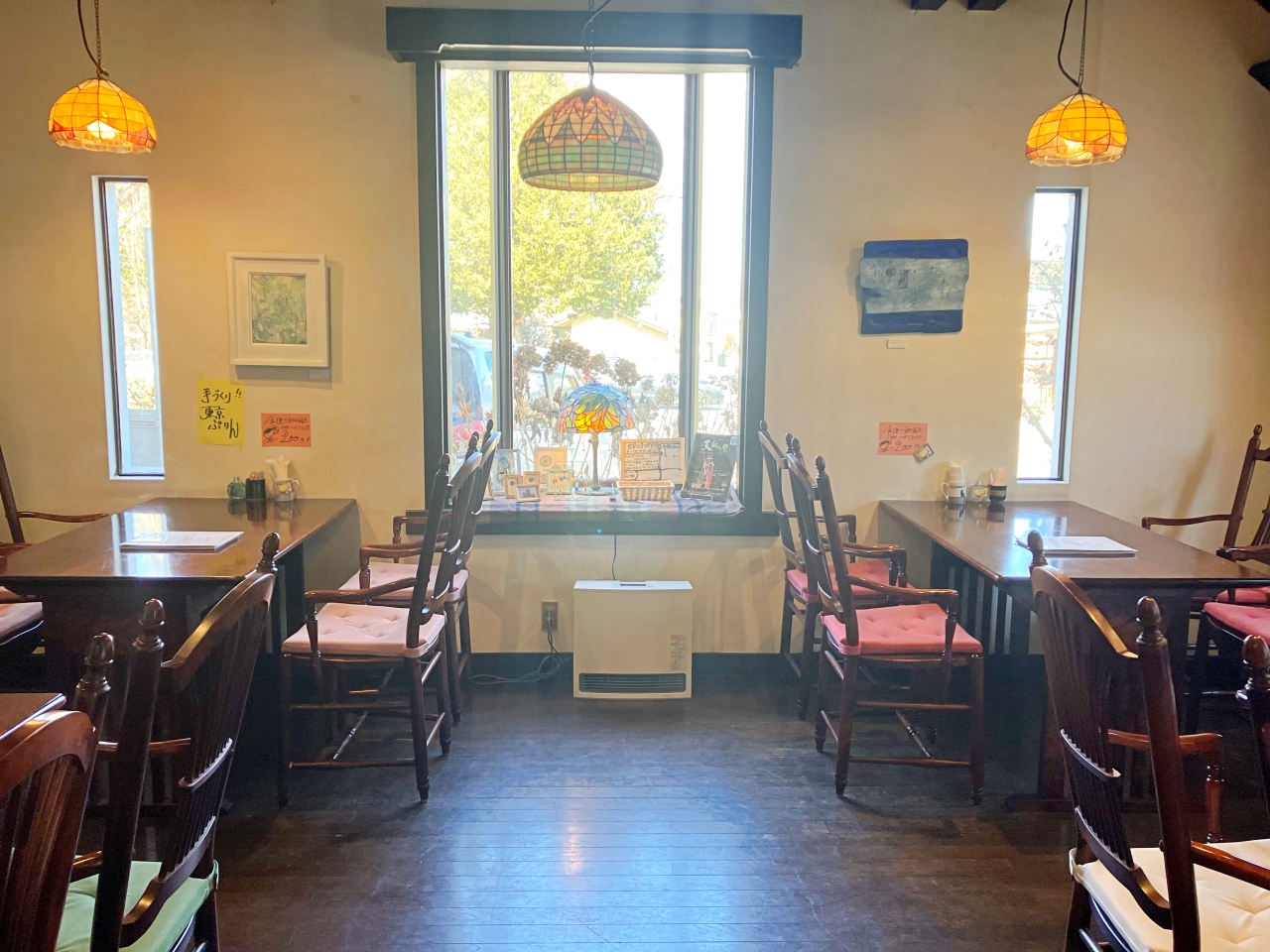 ステンドガラスの照明や昔ながらのテーブルとチェアが落ち着いた雰囲気を作る「安曇野カレーのGEN」の店内。