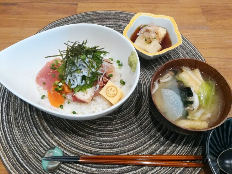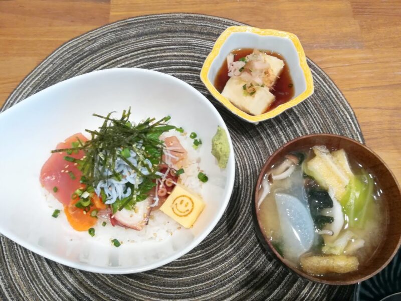 漁師丼はマグロ・サーモン・タコ・ブリ?などがのっています。