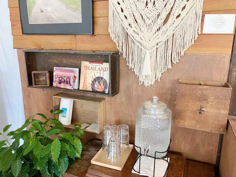 カフェスペースするときは、お水はセルフ。昔の雰囲気が残るどこか懐かしい部分があったりと、ワクワクするリノベーションですね。