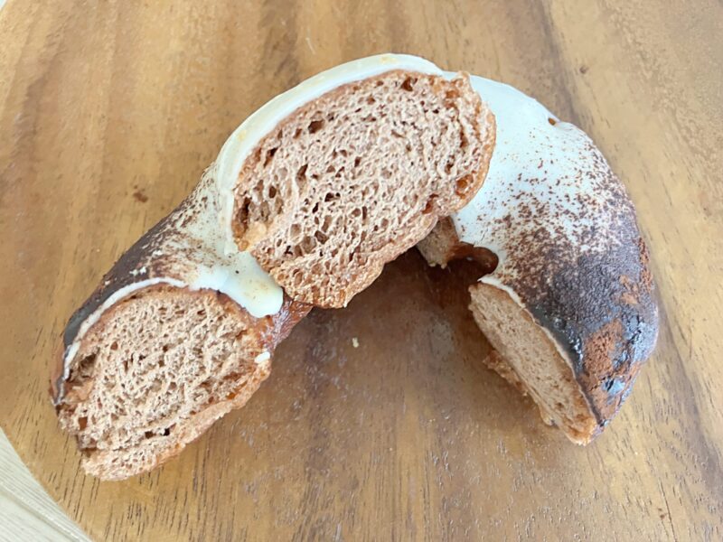 表面にふんわりとかかったココアパウダーと、生地に練り込まれたココアが重なり合い、ひと口かじるごとに深みのある風味が広がります。甘さ控えめで、ほろ苦さの中にやさしい甘みを感じられる一品でした。