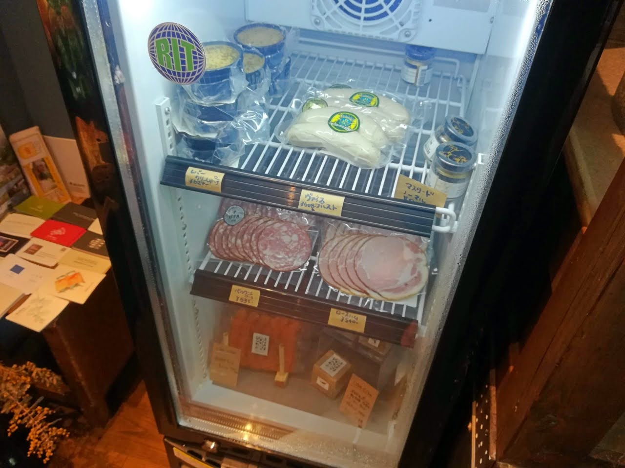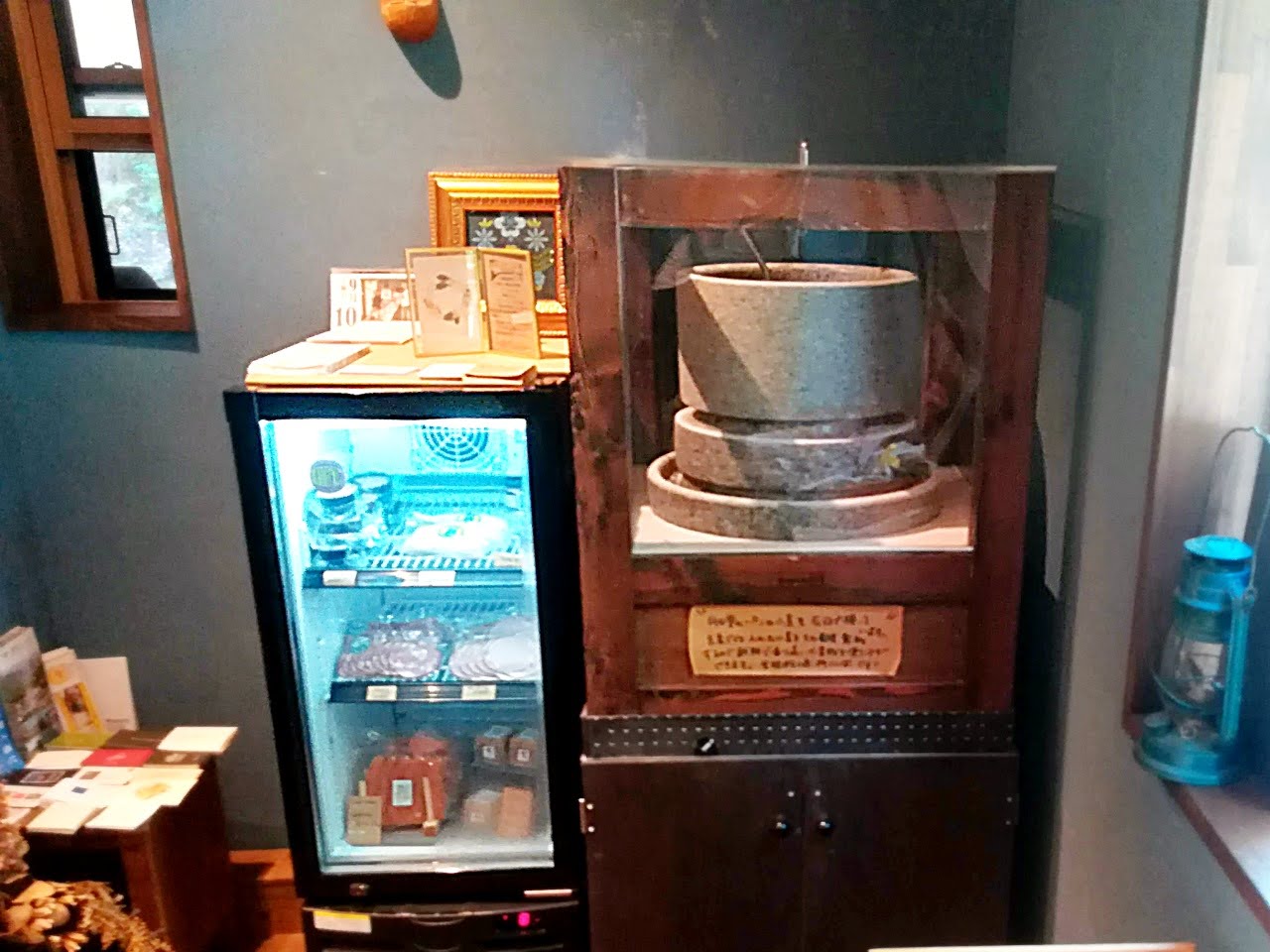 お店の奥には、石臼も置いてありました。隣には、パンに合わせるハムなども販売。