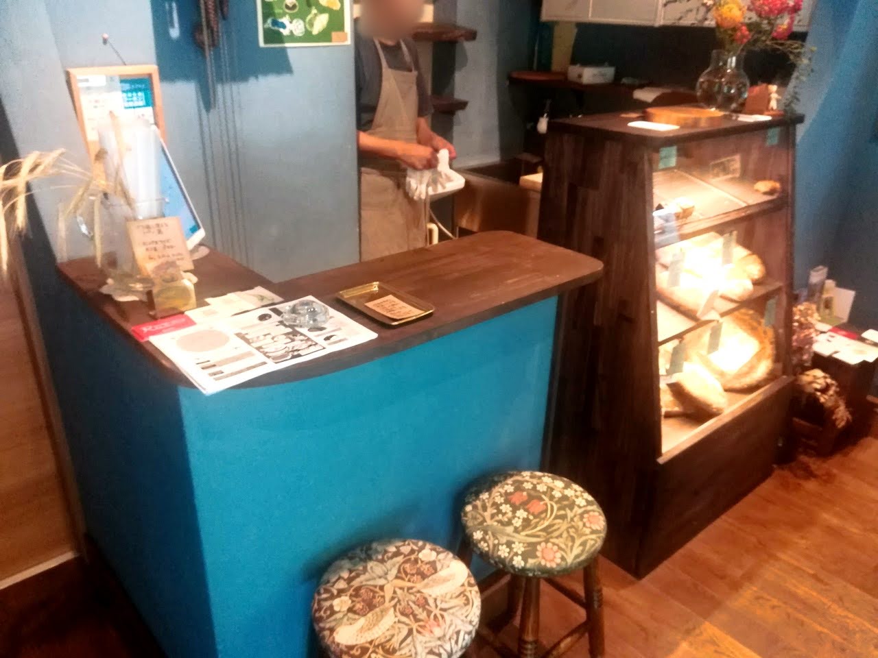 落ち着いたブルーの店内には、大きな木のショーケースが置いてあります。