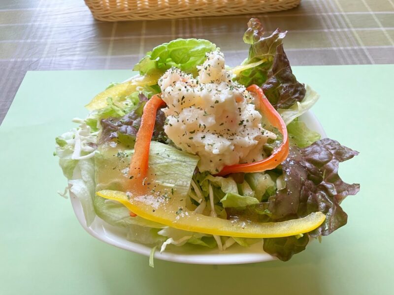 ハーフサイズは同じ値段でミニサラダがセットに。