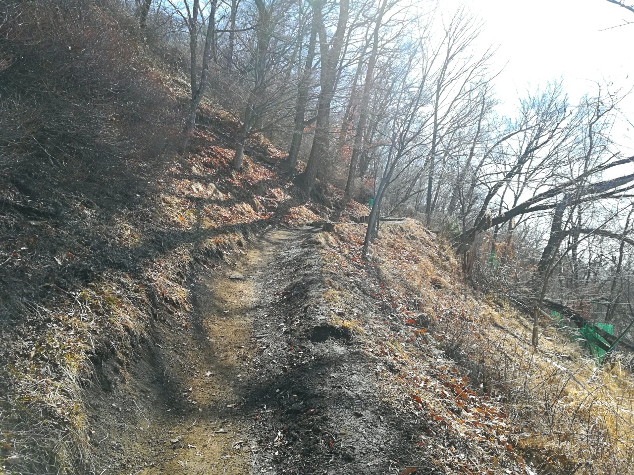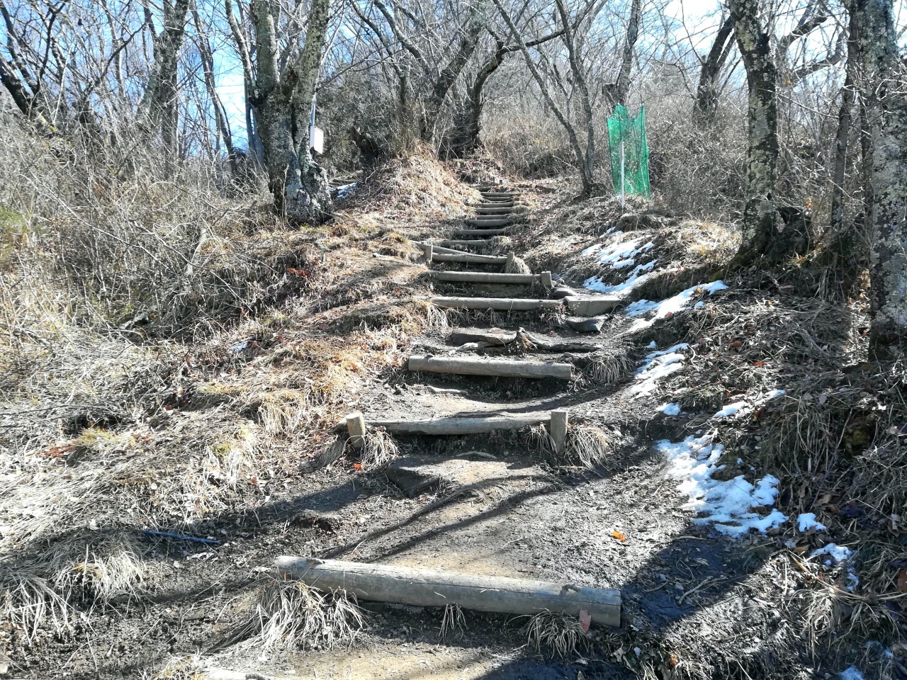 山頂の中間地点に到着。小さなベンチが上がったところにあるので、一休みするのもおすすめです。