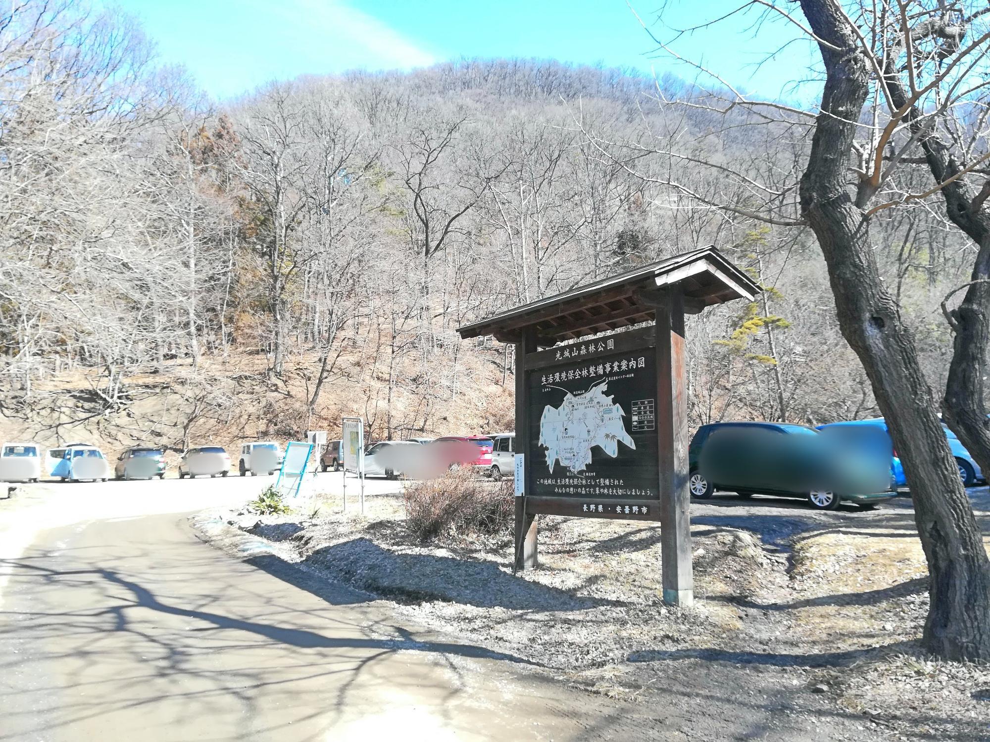 住宅街にある光城山登山口の看板を曲がり、登ってくると駐車場があります。暖かい3月初旬の午後。意外と多くの方が来ていますね。