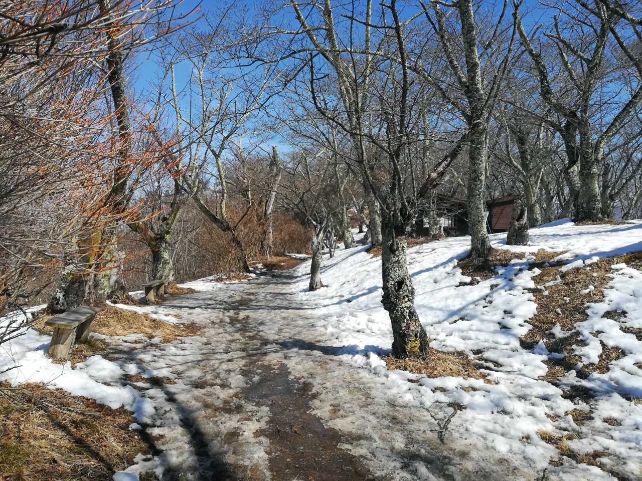 山頂付近の桜並木を抜けると休憩小屋に到着します。