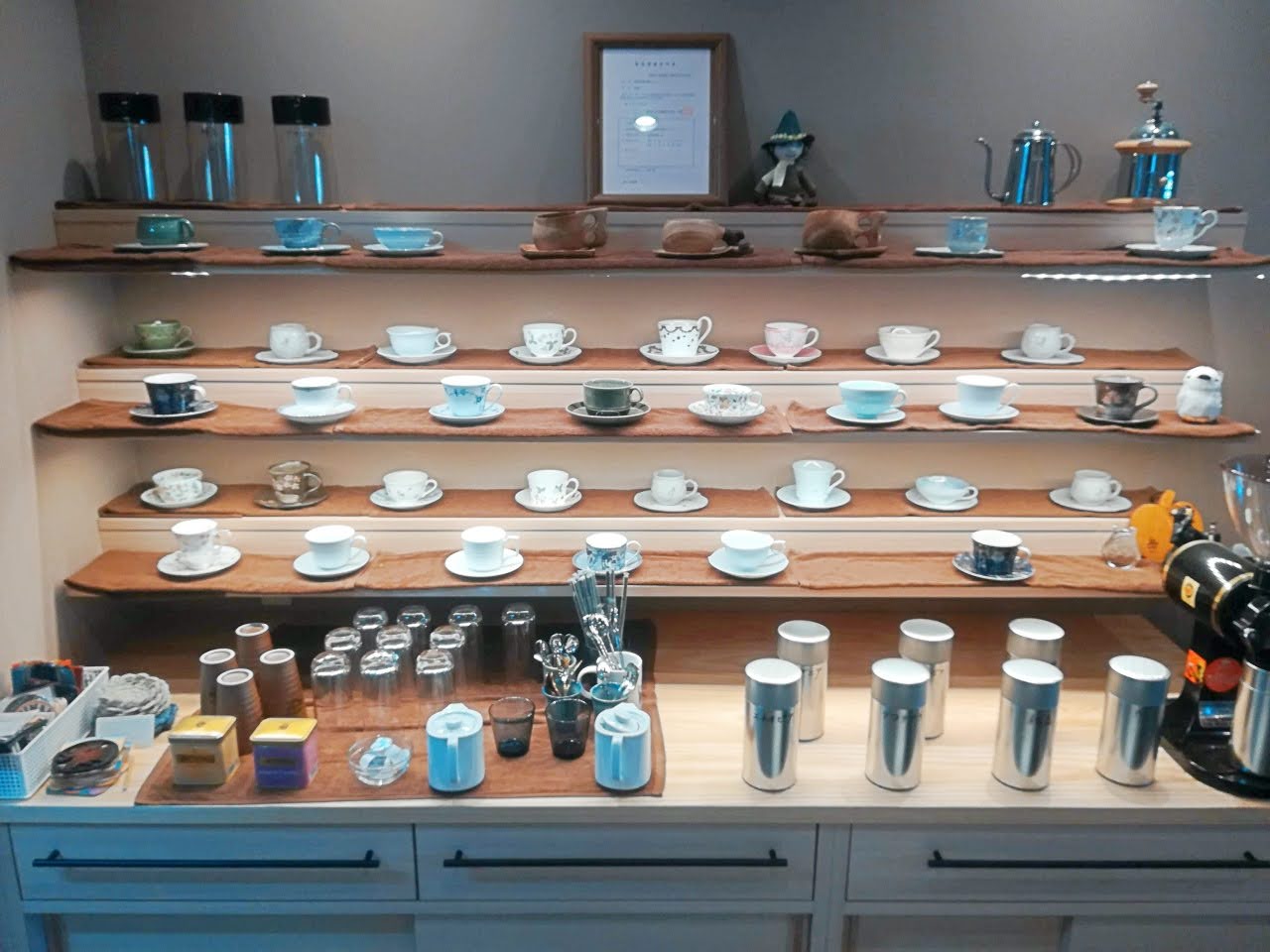カウンターの奥に並ぶ綺麗なカップたち。