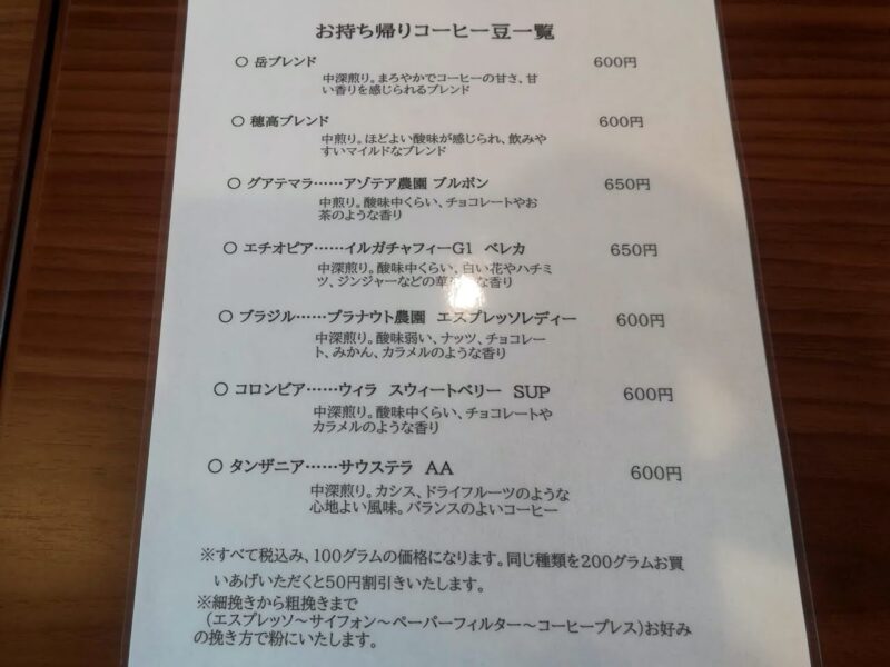 「自家焙煎珈琲 岳」のメニュー