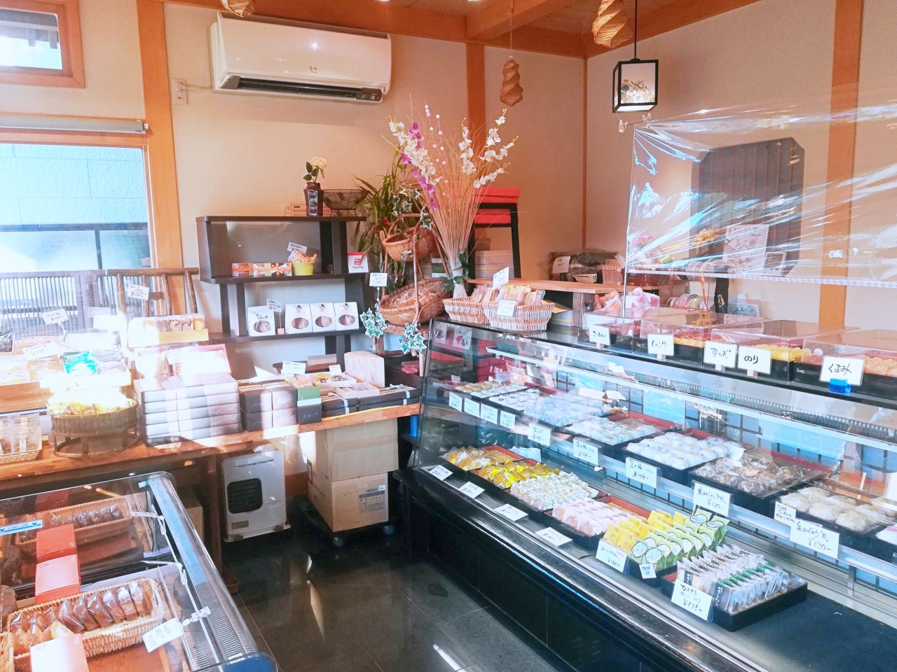 ロールケーキやシューなどの洋菓子、団子や大福などの和菓子が並ぶ「菓子処 おおほり」。