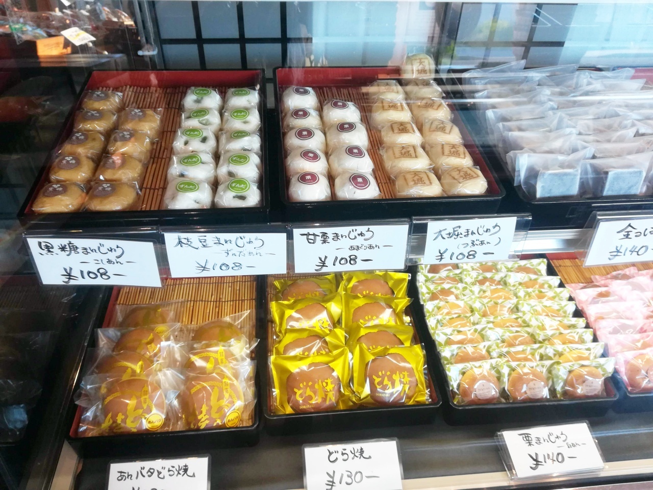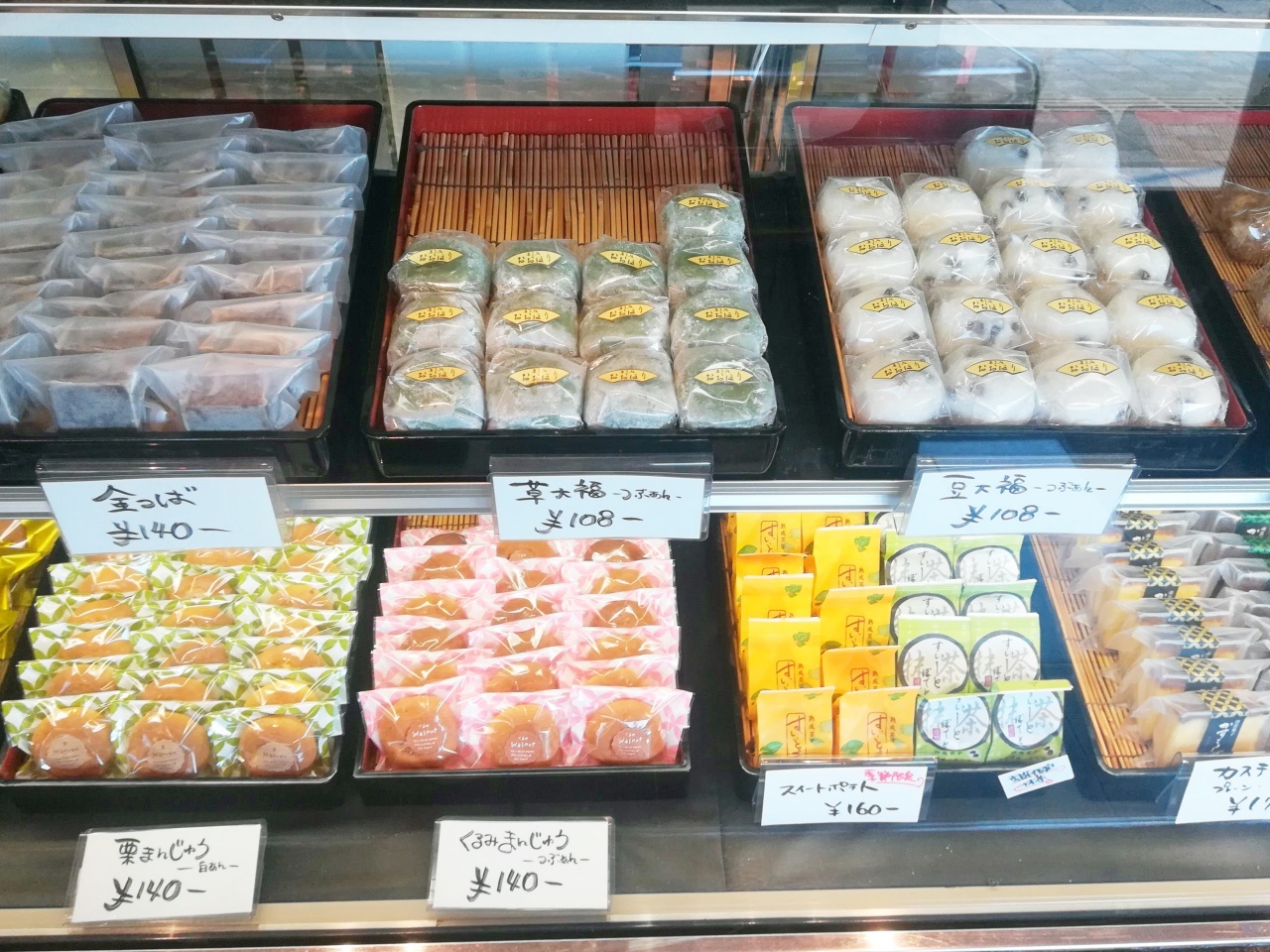 豆大福や草大福、おまんじゅうなどが勢揃い。お値段も手頃ですね。