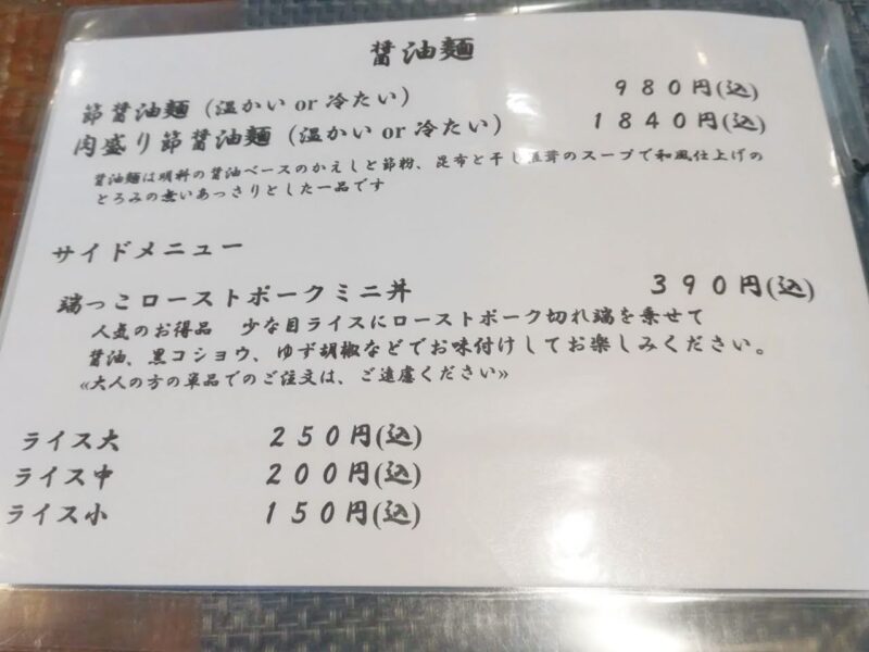 気になっていた節系ラーメンから、「やはり始めは醤油かな」と節醤油麺にしました。