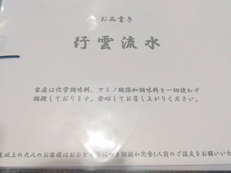「行雲流水(こううんりゅうすい)」では、化学調味料やアミノ酸添加調味料は使っていません。
