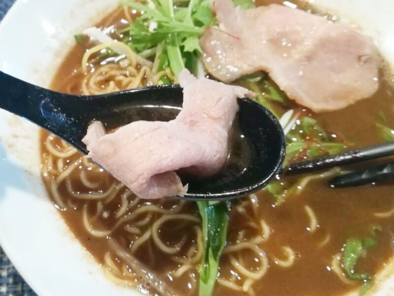「行雲流水(こううんりゅうすい)」のラーメンには、長時間低温調理したローストポークが添えられてきます。