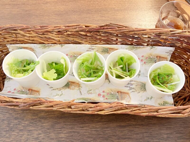 シャキシャキ野菜に5種類のドレッシングをそれぞれかけてくれますよ。