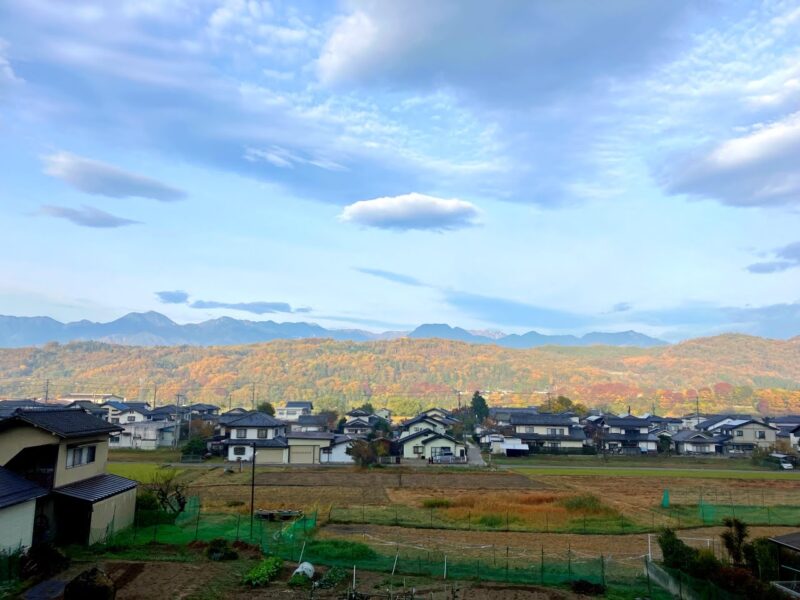 三五山トンネルに向かって歩いていくと、紅葉の里山と北アルプスの最高の景色が楽します。