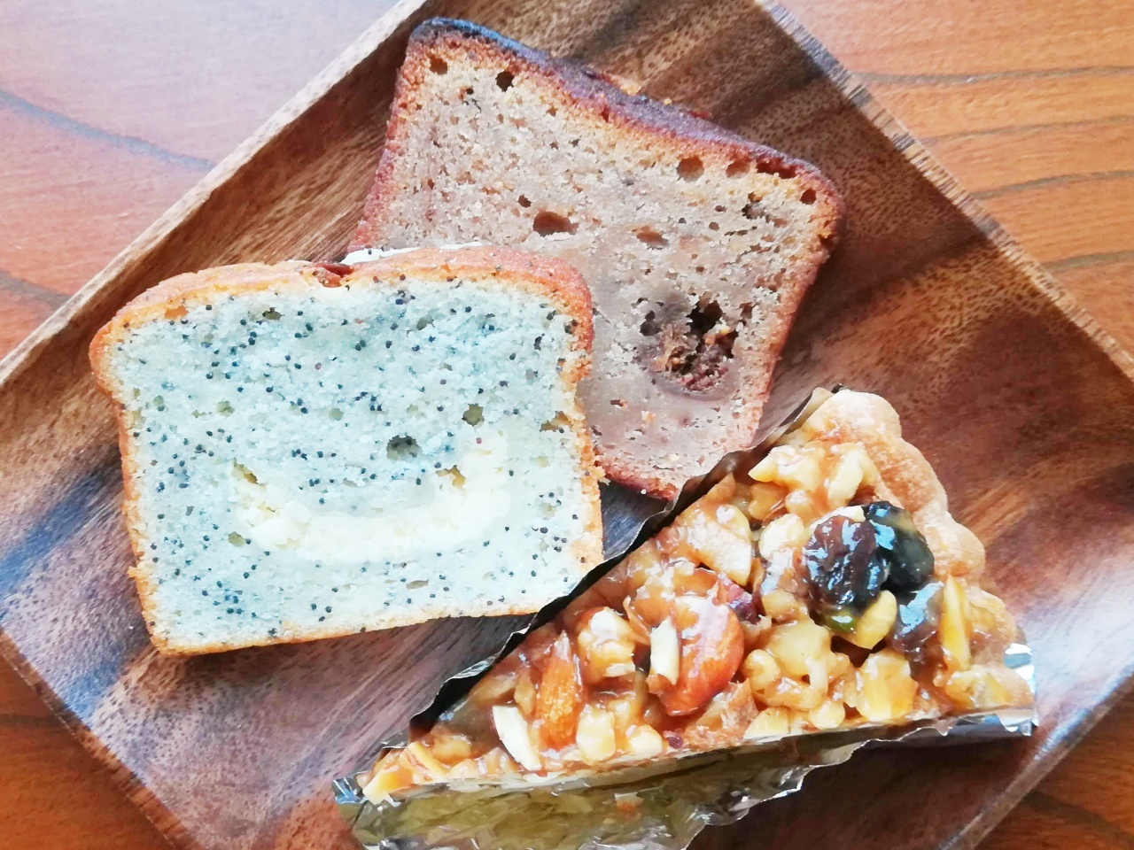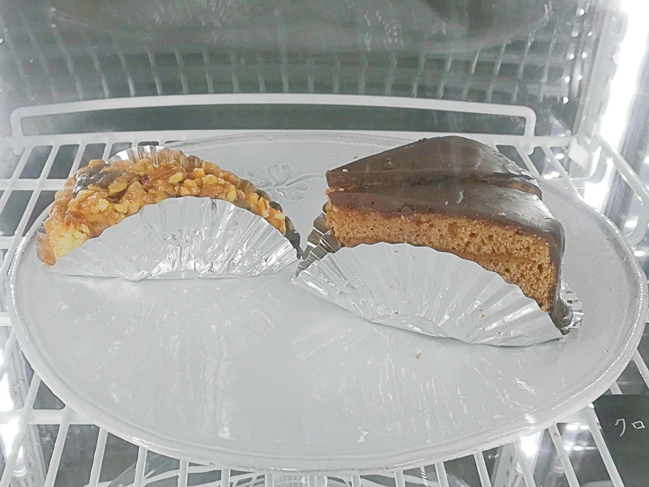 木の実たっぷりのナッツタルトと、チョコレートケーキのクロチュール。