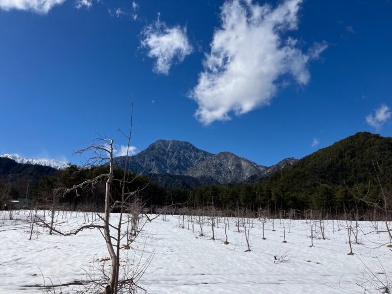今の時期はりんごはありませんが、有明山をバックにすばらしい景色が広がる「森の果樹園」さん。