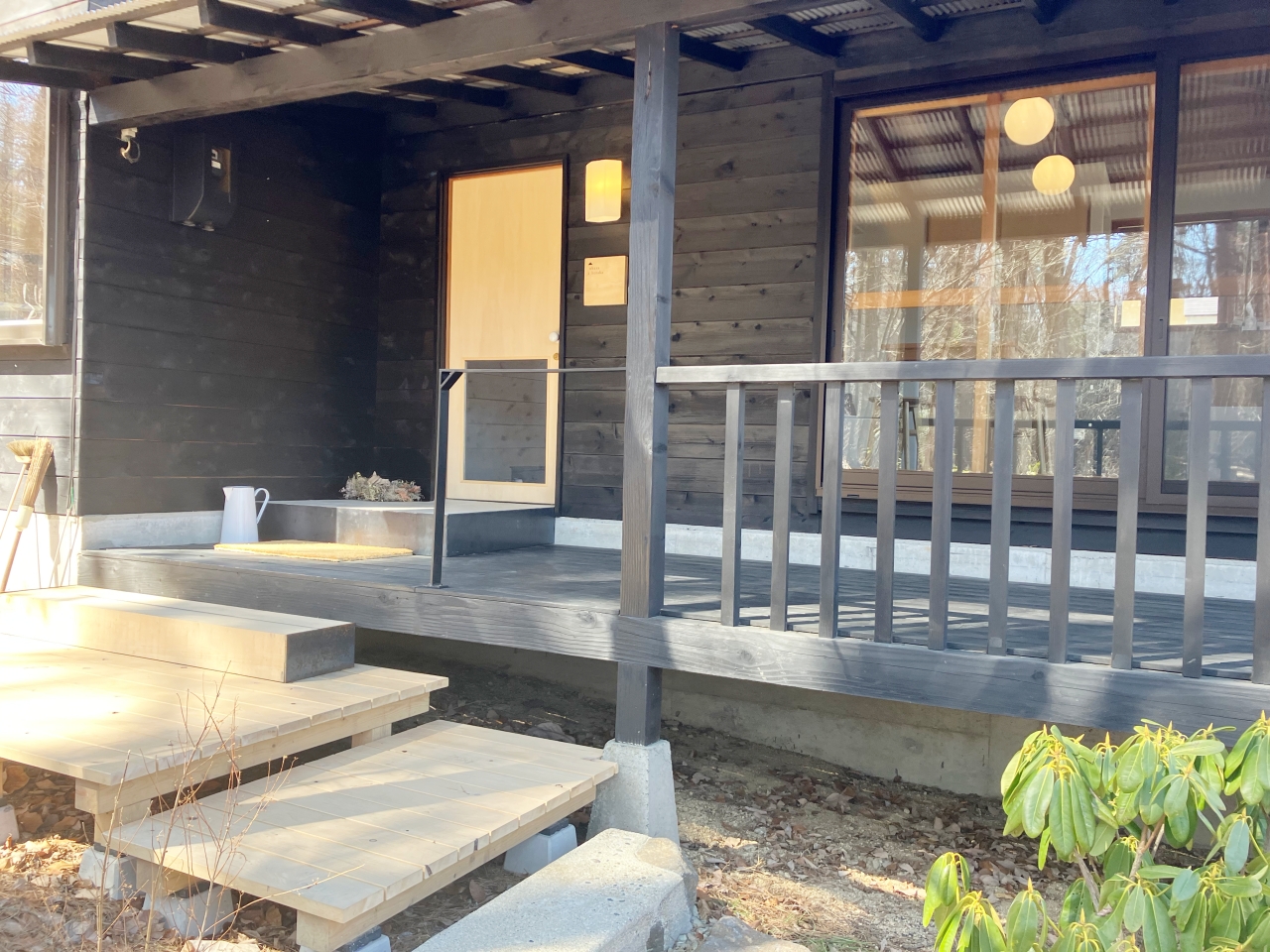 車を置いて奥に進むと、真新しいデッキが作られていました。入り口までの道も、水差しがあったりドライフラワーが置かれていたりと、目で楽しませてくれます。
