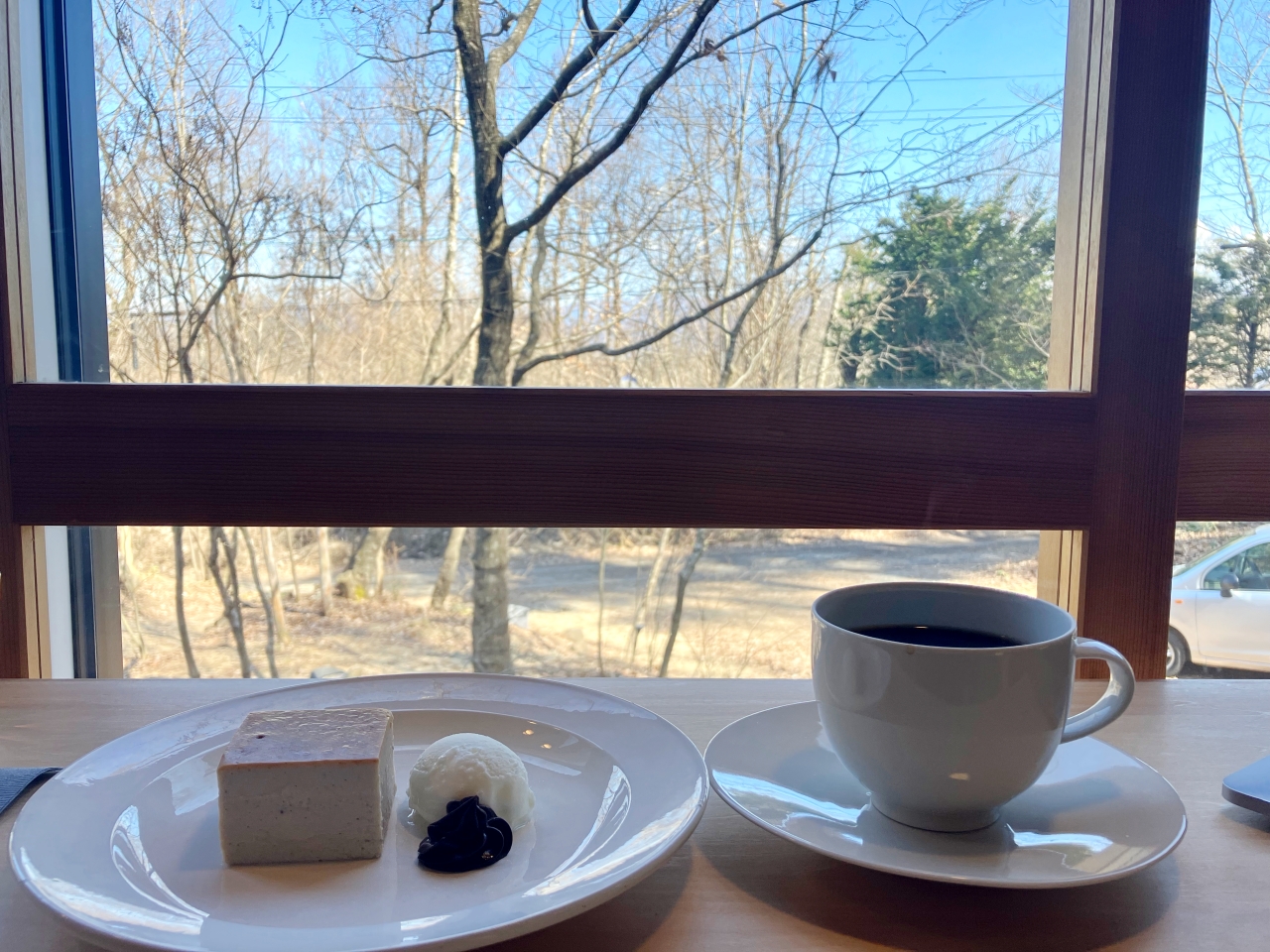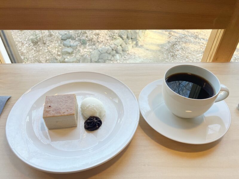 今回は苺のチーズケーキと、コーヒーを注文しました。ンプルなデザインで、森の景色の中にすっと溶け込むような雰囲気ですね。