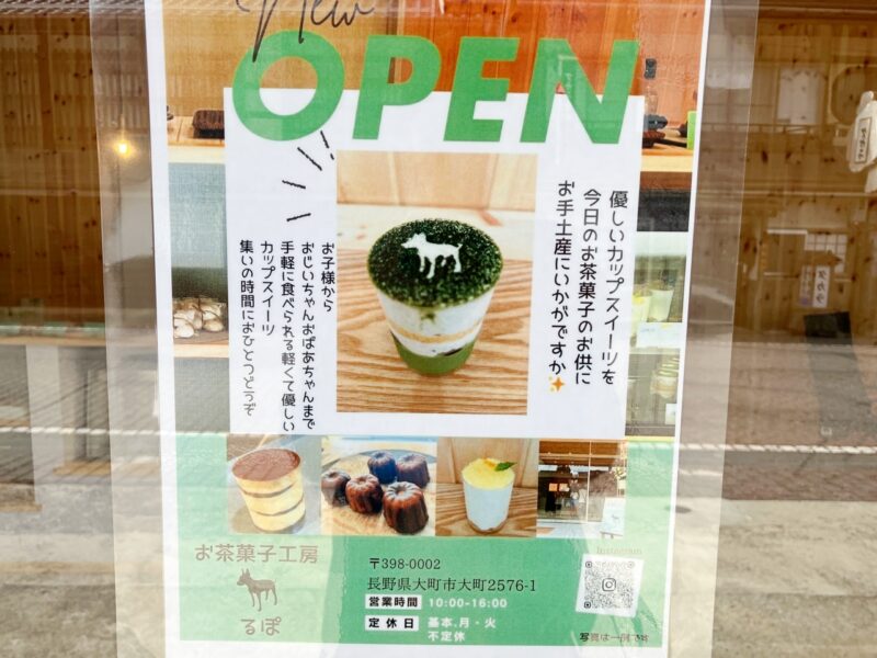大町市を散策していたところ、新しいお菓子屋さんを発見しました。カップスイーツや焼き菓子が楽しめる「お茶菓子工房 るぽ」さん。