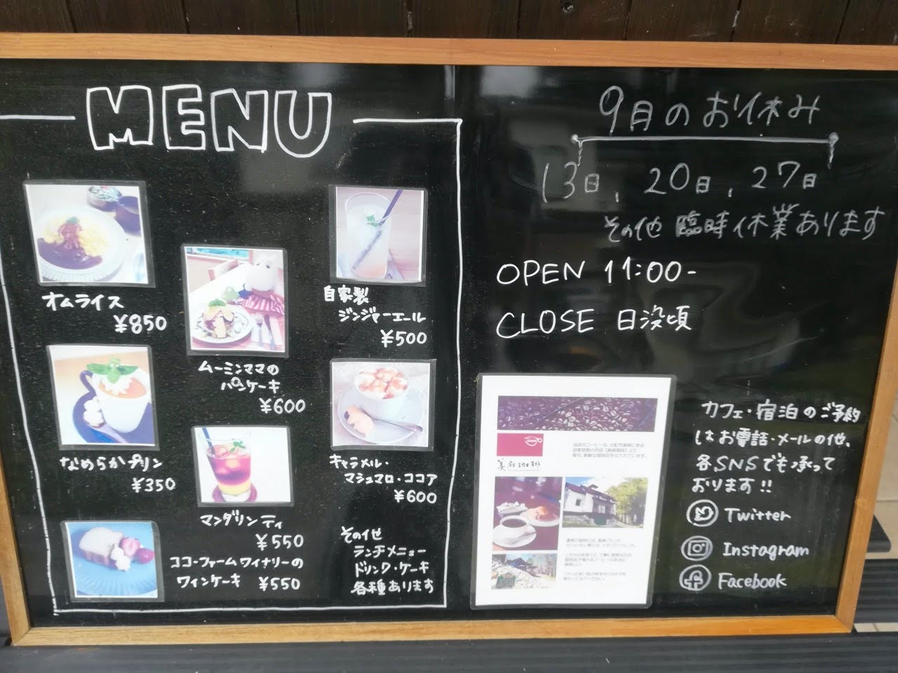表には、お休みやメニューなども書かれているので、チェックしてくださいね。最新情報はSNSで。
