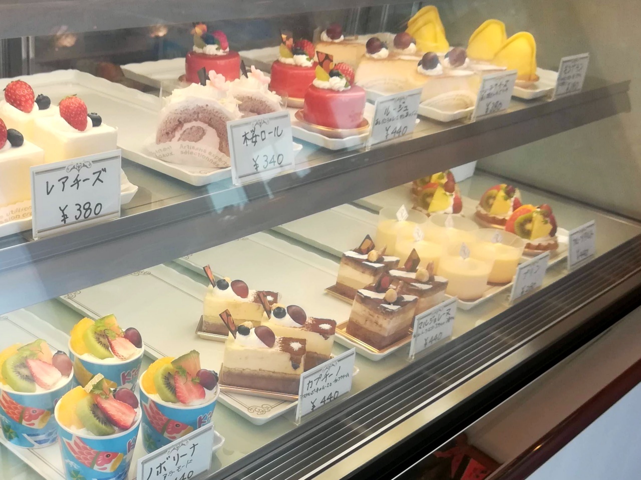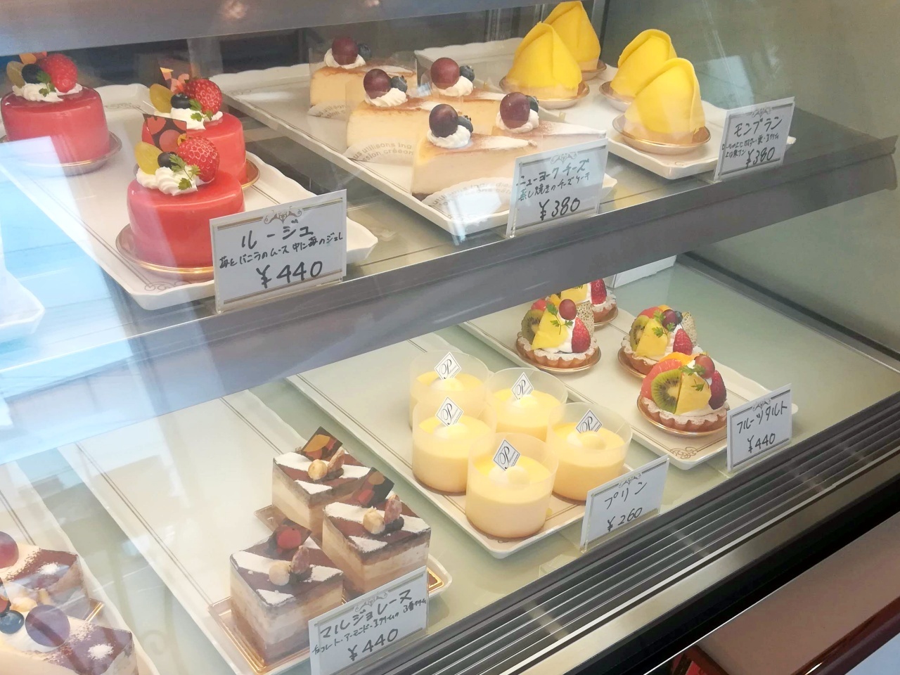 チーズケーキや桜ロール、プリン、タルト、マルジョレーヌなどいろんなケーキが並びます。