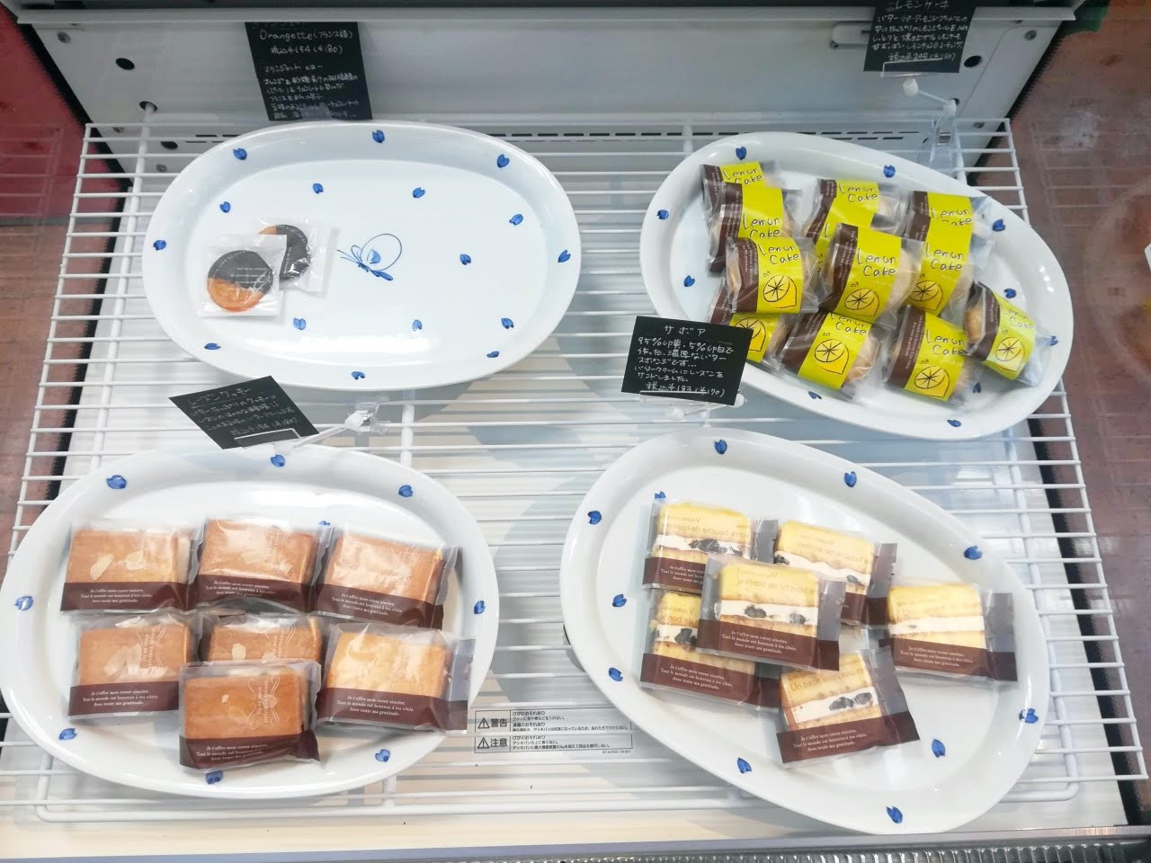 レーズンサンドやレモンケーキ、サボア、オランジェットなど、冷蔵のスイーツ。