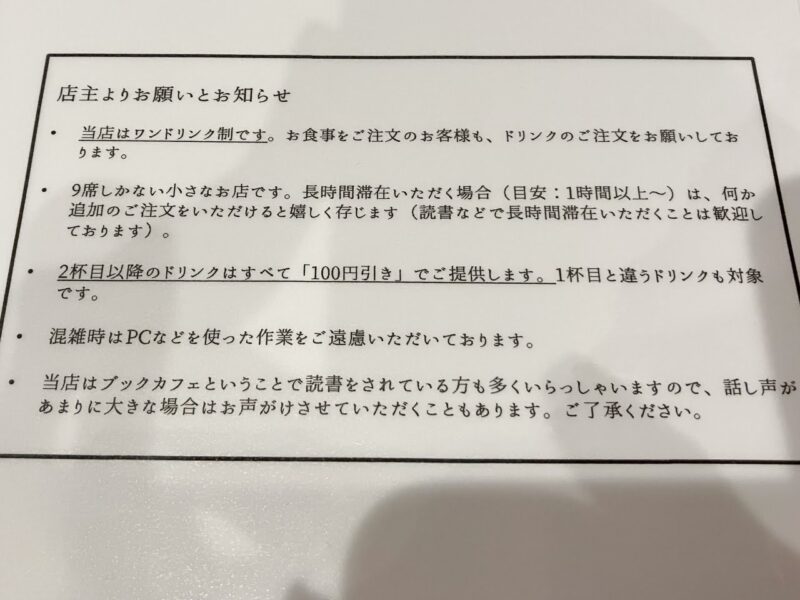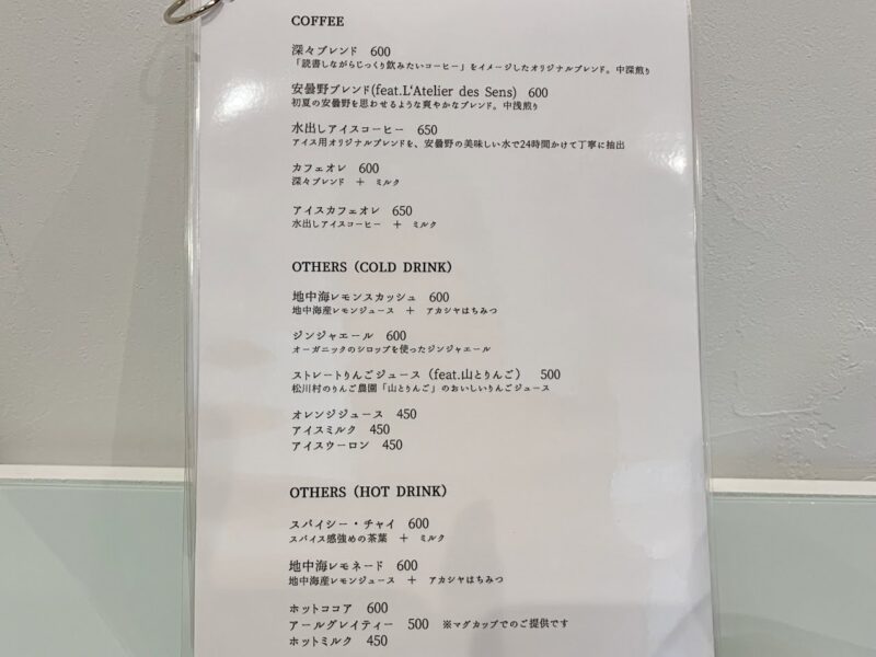 「深々 books & stay」のカフェは、ワンドリンク制です。食事やスイーツと一緒に楽しみましょう。
