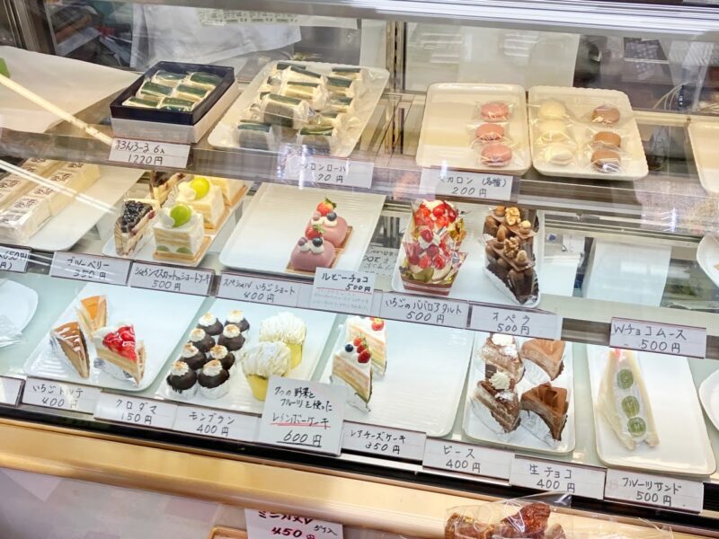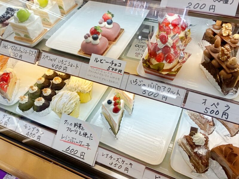 いちごのババロアタルトやオペラ、レインボーケーキ、モンブランなどが並んでいます。