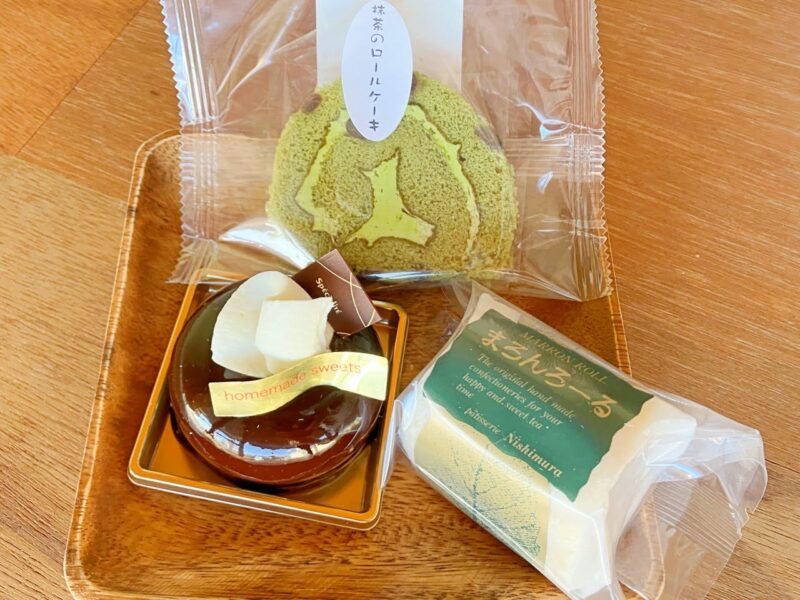 今回テイクアウトしたのは、抹茶のロールケーキ・生チョコケーキ・まろんろーるの3種類です。